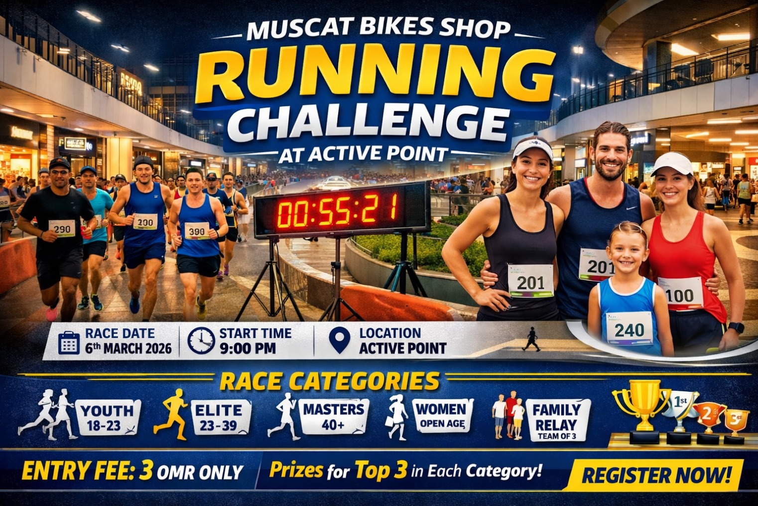 The Muscat Bikes Shop Running Challenge is an exciting community running event hosted at Active Point, designed to promote a healthy lifestyle and create a vibrant sports atmosphere within the mall. This event aims to attract a wide range of participants — from fitness enthusiasts to competitive runners — while raising awareness about active living in Muscat.