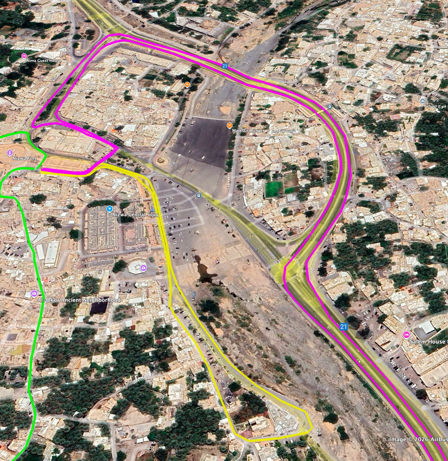 نقطة الانطلاق/الانتهاء: بالقرب من حديقة قلعة نزوى، لضمان السلامة ورؤية ممتازة للعائلات والجمهور